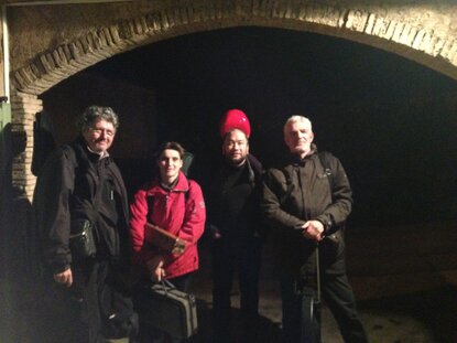 Voici Pierre Soulages avec un quatuor de musiciens. Ils ne sont pas inspirés par Soulages et s’exclament. Ils veulent vous parler de lui.
